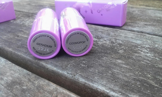 The wear time on both lipsticks is about the same, a few hours (give or take if you're eating/drinking or not). Geradium is a little more high maintenance of lipstick than Cosmopop but it isn't something that would make keep me from buying them. Touching up isn't too bad either, unless you have extremely dry/flaky lips.