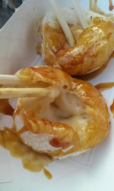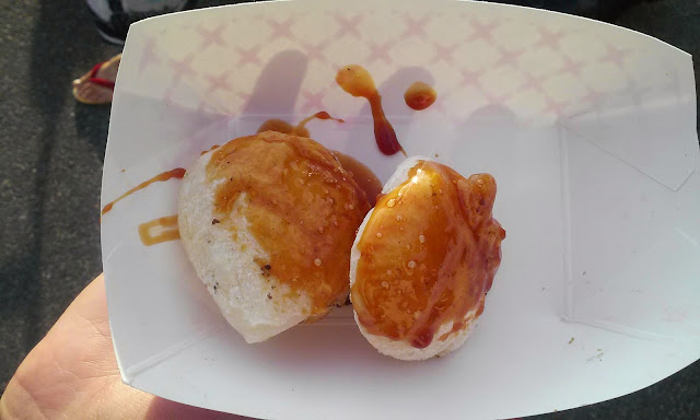 Then, this was the first time I have seen them make this at the festival, but they had grilled mochi which is one of my favorites! Mochi is a Japanese rice cake made out of glutinous rice that is very chewy in texture. This one was grilled and topped with a sauce made out of soy sauce and sugar. The mochi was nice and crunchy on the outside, and very warm and chewy on the inside. It could've used a bit more of the sauce, but it was still good!